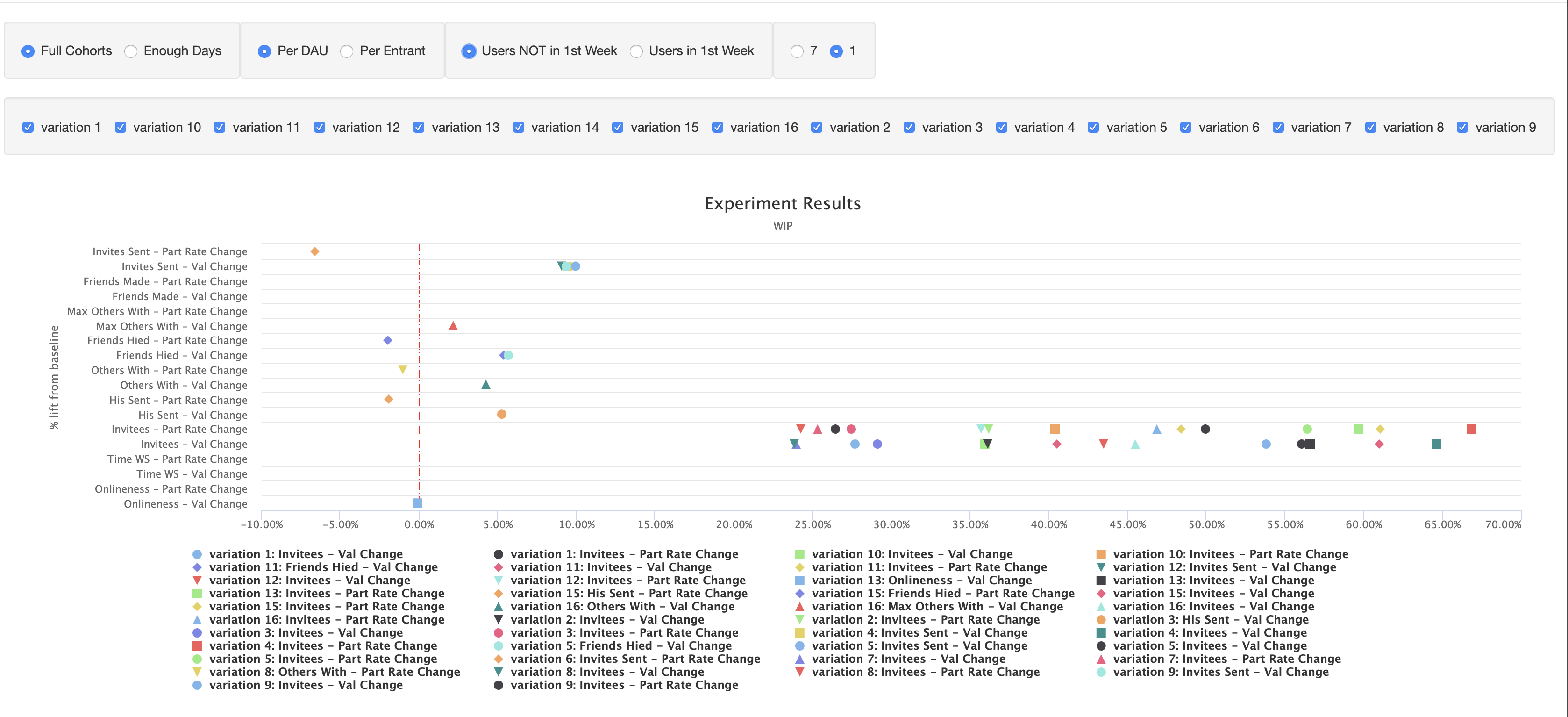 Every experiment has a default set of global metrics (retention, online-ness, and time in conversation) as well as additional local metrics unique to the experiment.