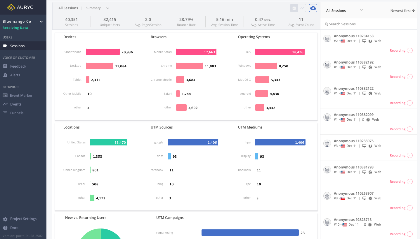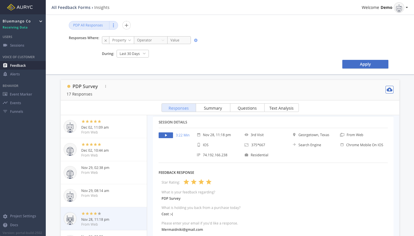 Auryc captures 100% of engagement events and content for customers and visitors - a high fidelity record of users’ digital journeys including all clicks, views, swipes and user input data, system performance data plus CSAT, NPS surveys and feedback